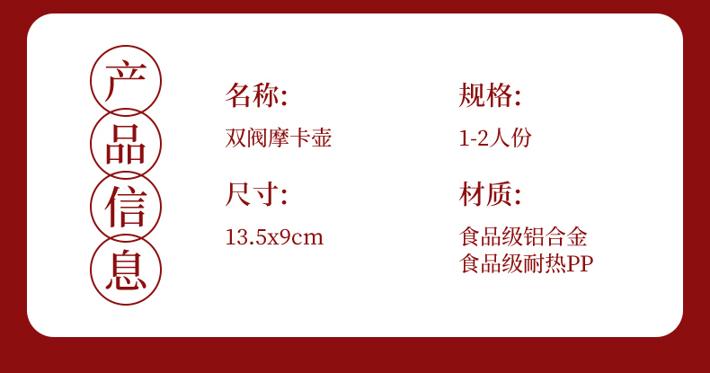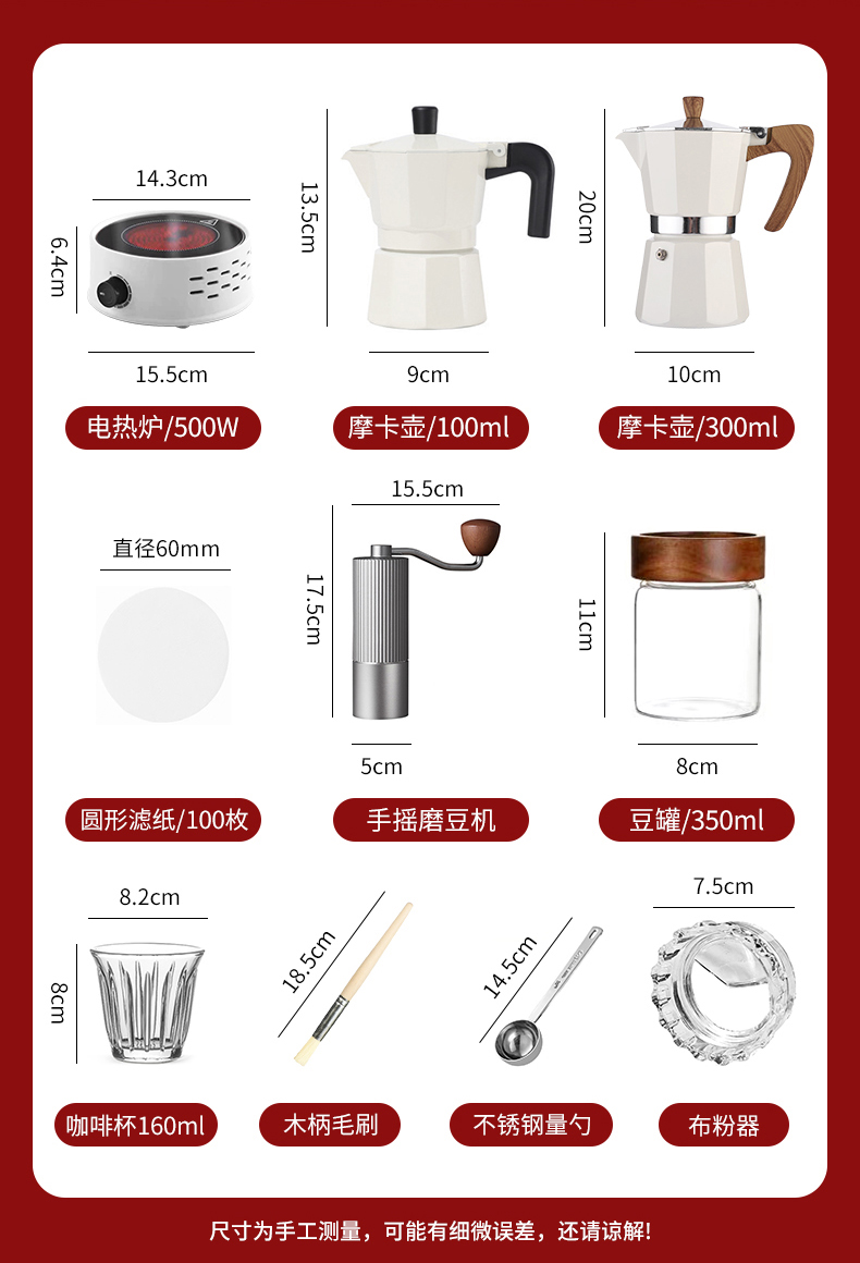 【產(chǎn)品配置】雙閥版-摩卡壺+楠竹豆罐+毛刷+不銹鋼勺+布粉器+圓形濾紙*100 【產(chǎn)品型號(hào)】KF-07 【產(chǎn)品顏色】白色、黑色 【定制工藝】印刷、雕刻 【包裝尺寸】50X37.5X12cm