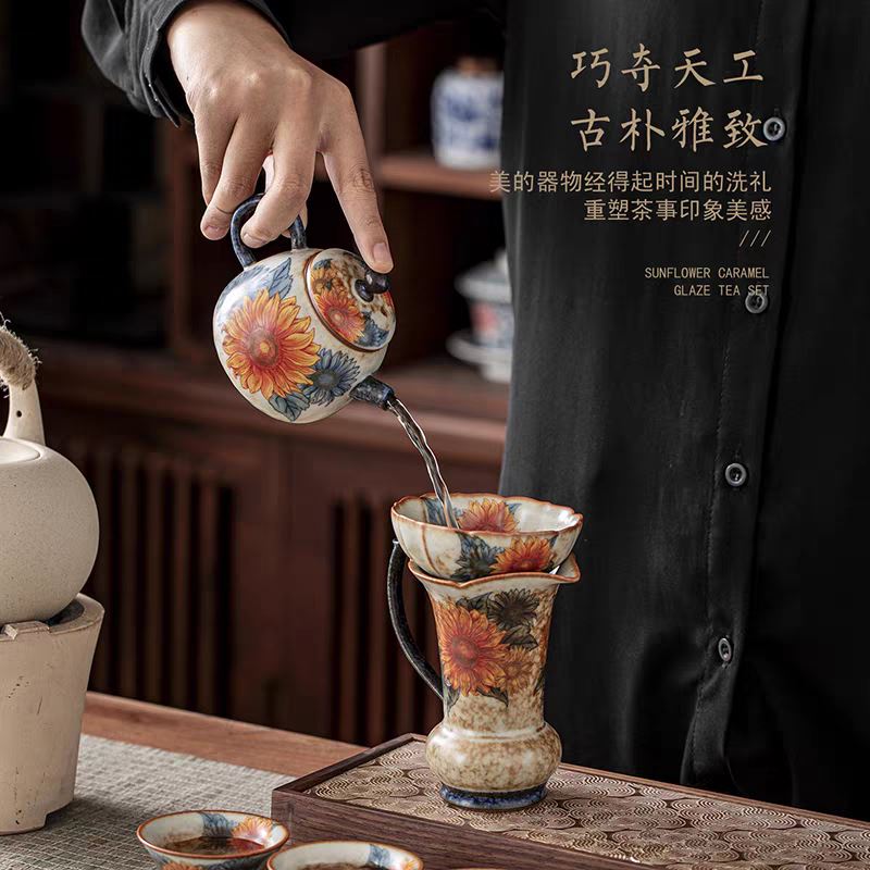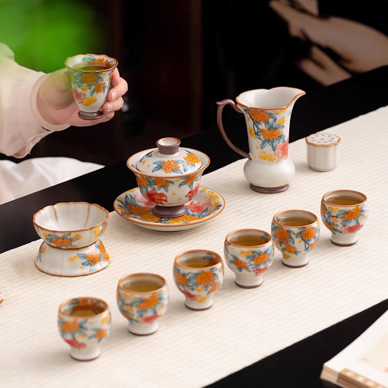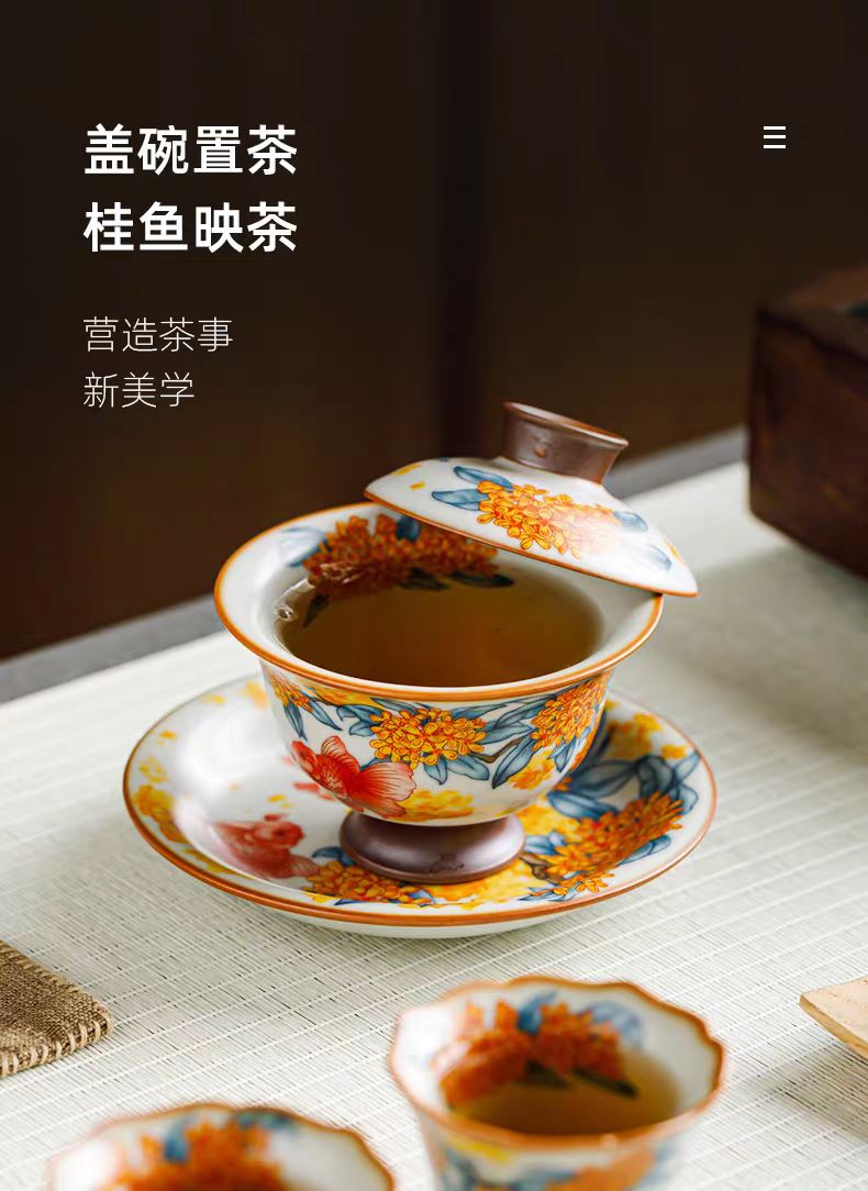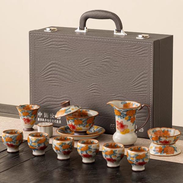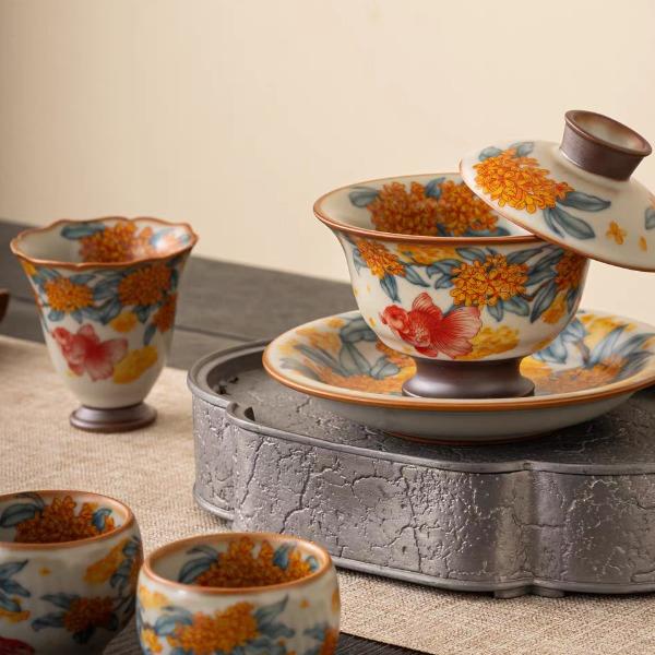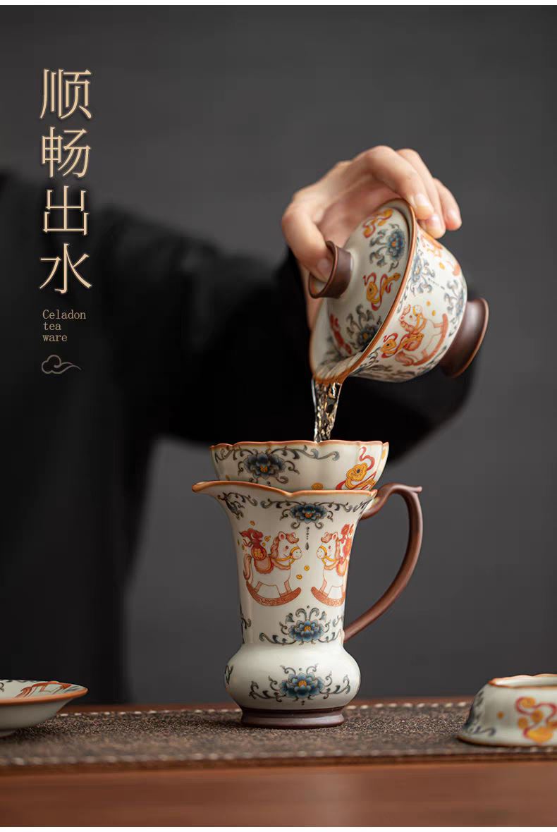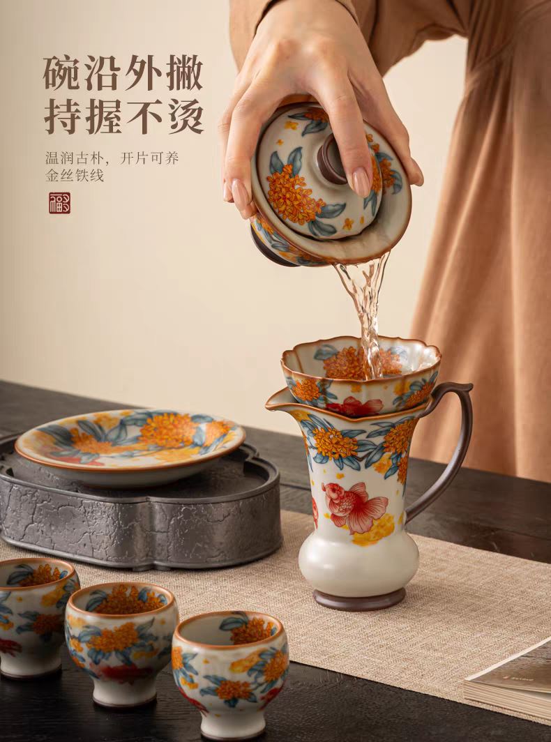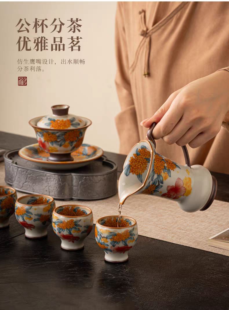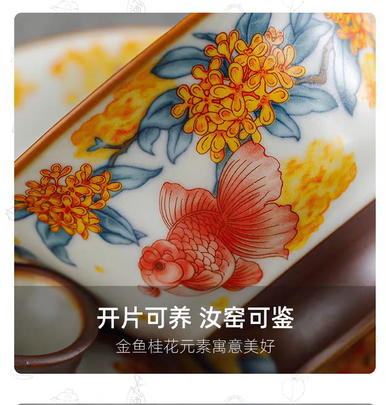 鵬翼馬年開門紅馬上有錢、金桂獻(xiàn)鯉亞黃汝窯茶具大套裝
