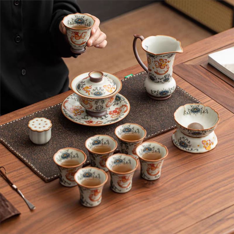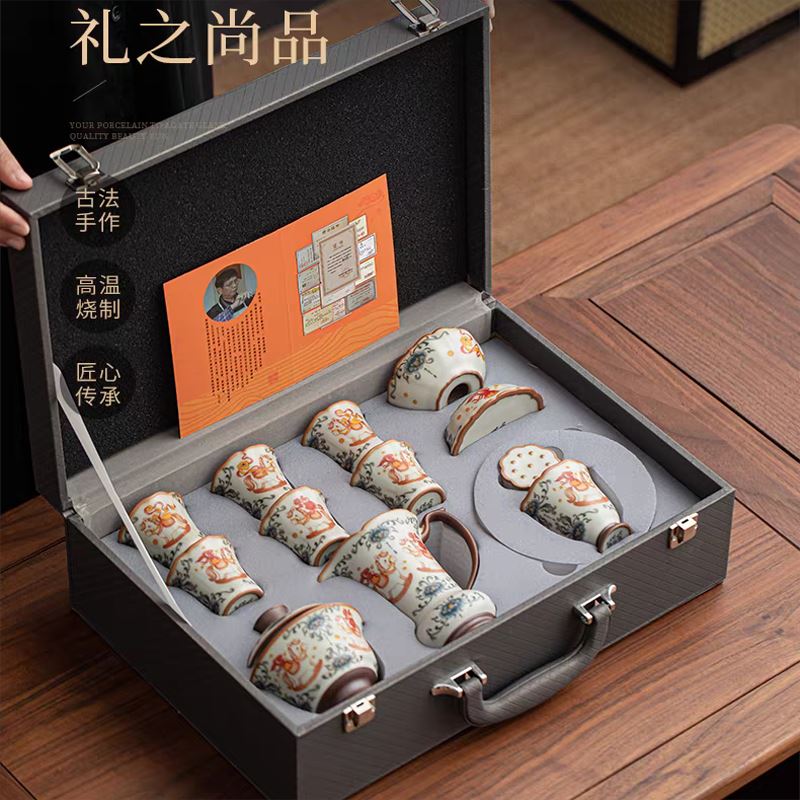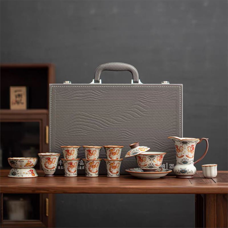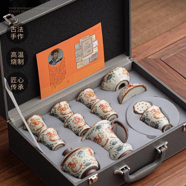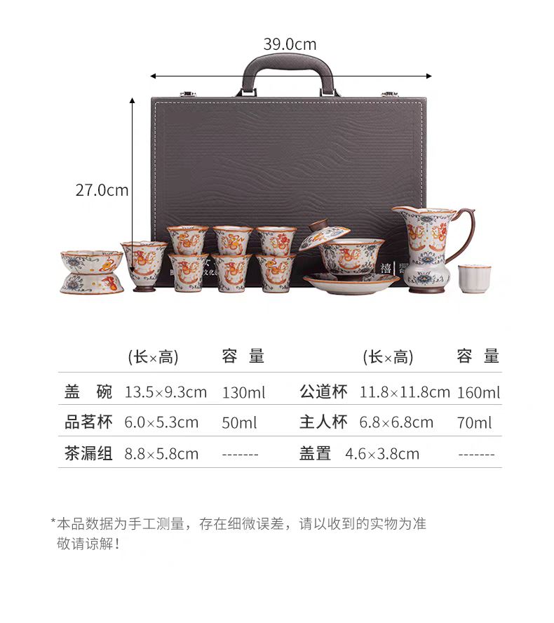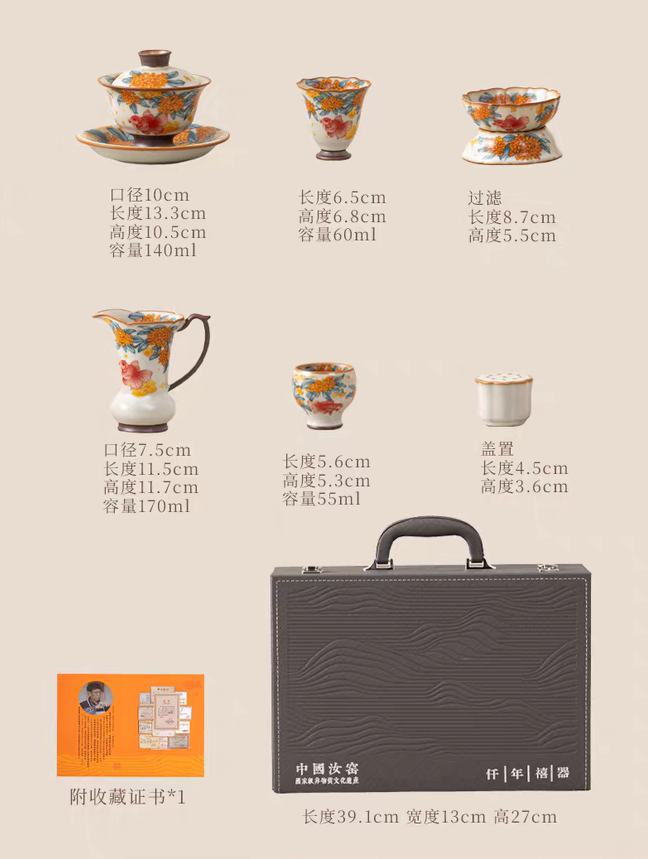 配制: 1蓋碗 6杯 1壺承 1主人杯 1蓋置 1公道杯1茶托1茶漏 1收藏證書 1皮箱
