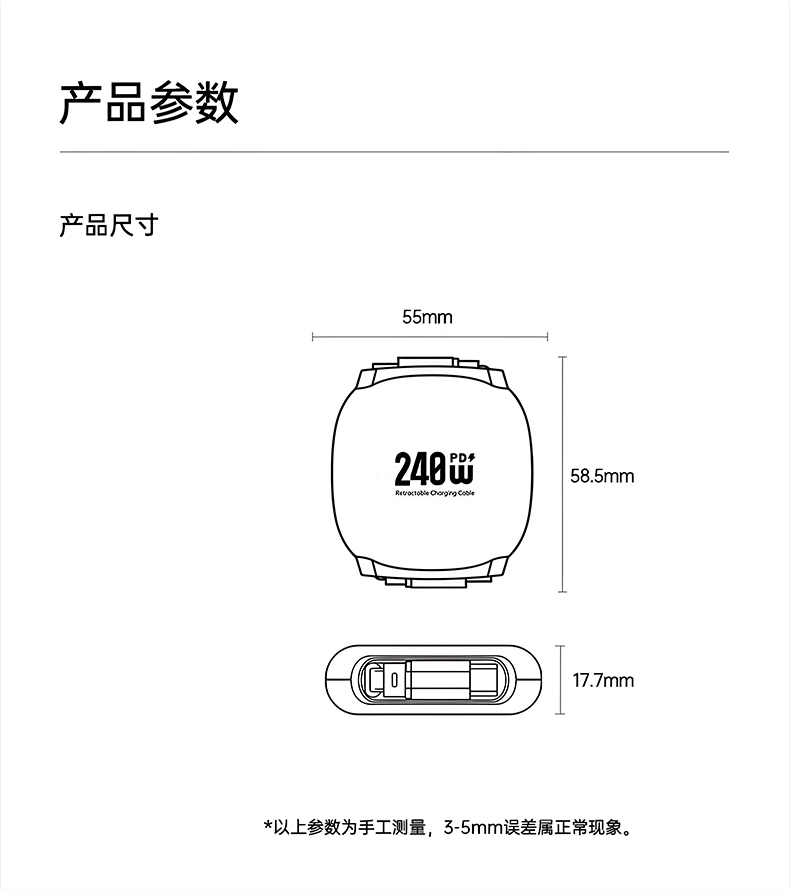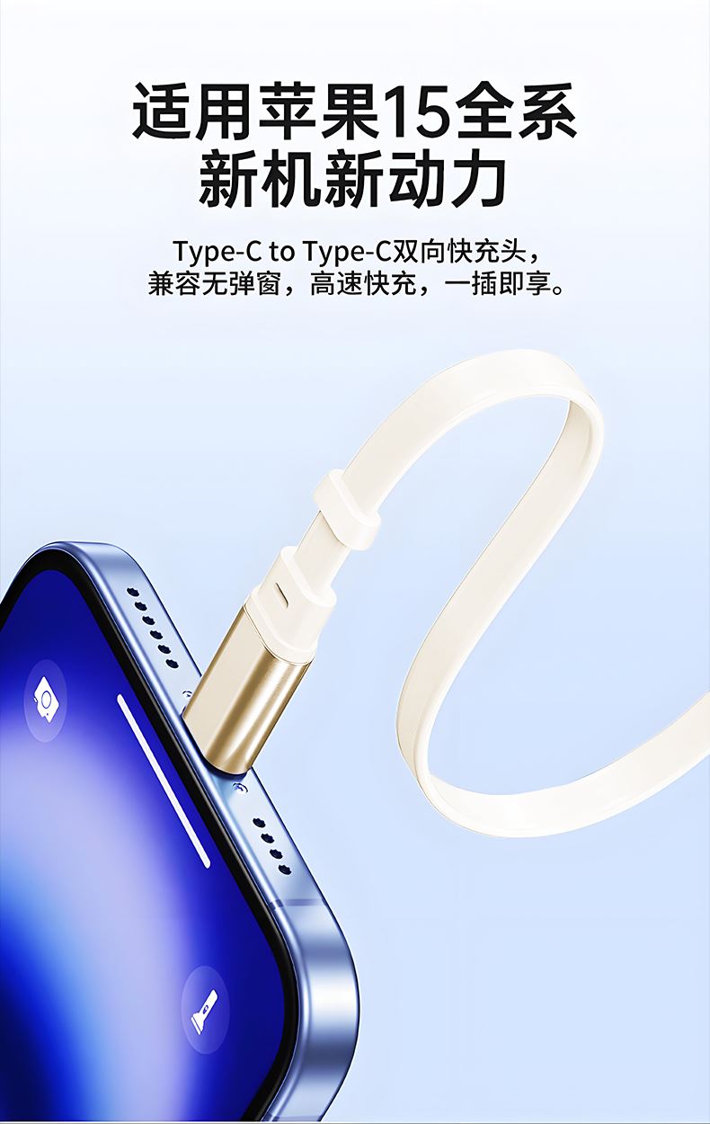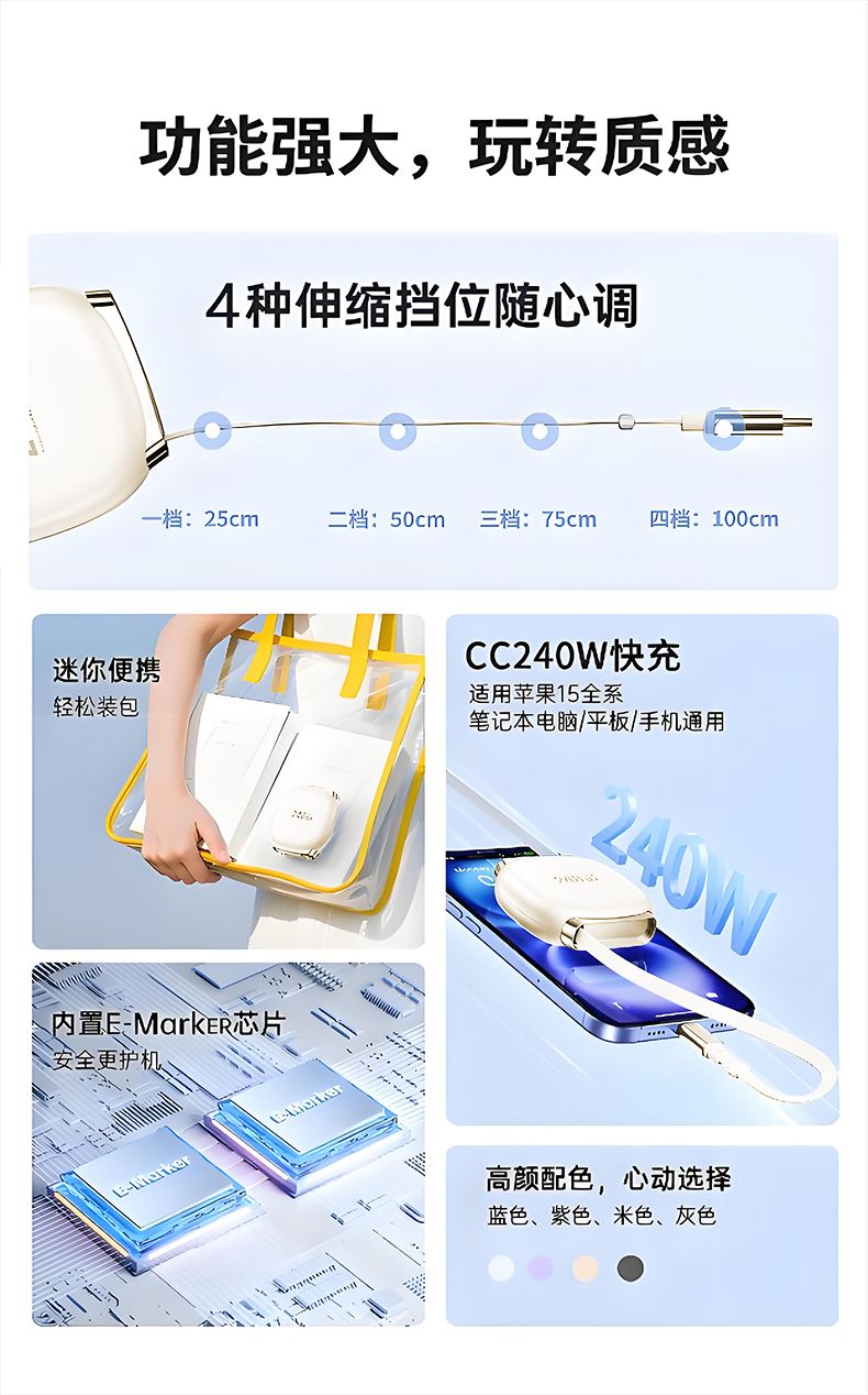 產(chǎn)品顏色:米色 材料:鋁合金+Abs+TPE 功率:240W(Max) 傳輸速率:480Mbps 長度:1米 適用:蘋果,安卓各類手機 產(chǎn)品尺寸:55*17.7*58.5mm 包裝尺寸:90*60*30mm 整箱數(shù)量:100個 單品重量:50g