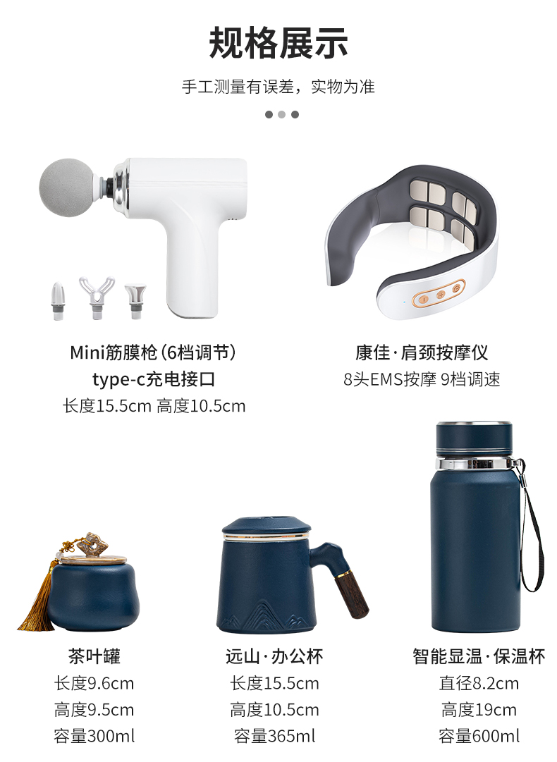 公杯:16*10厘米 茶葉罐:8.2*8厘米 禮盒 :48*12*23厘米 辦公杯 茶葉罐 保溫杯 筋膜槍 禮盒 配置齊全,商務(wù)實(shí)用,陶瓷高溫?zé)?,無鉛鉻,送禮自用兩相宜。