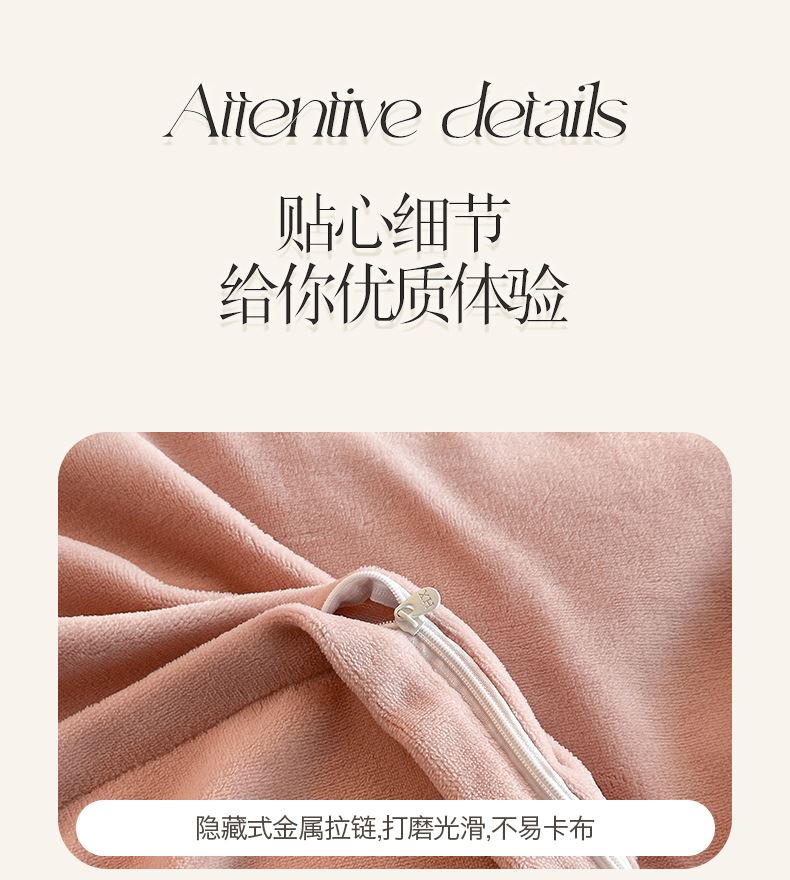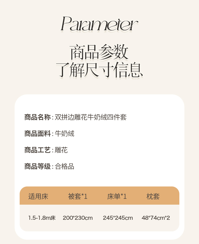 被套:200×230cm 床單:245×245cm 枕套:48×74cm 適用:1.5M-1.8M床 面料:牛奶絨(抗靜電) 款式:寬邊 風(fēng)格 : 輕奢風(fēng)格 套件采用高克重全消光?;ńq面料,24H保暖呵護(hù)整夜溫暖,柔軟細(xì)膩,貼膚保暖,面料植入導(dǎo)電絲,免去靜電煩惱,溫暖整個(gè)冬季。