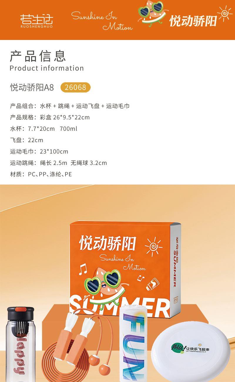產(chǎn)品組合:水杯+跳繩+運動飛盤+運動毛巾 水杯:7.7*20cm 700ml 飛盤:22cm 運動毛巾:23*100cm 運動跳繩: 繩長2.5m 無繩球3.2cm 材質(zhì):PC、PP、滌綸、PE 包裝:彩盒
