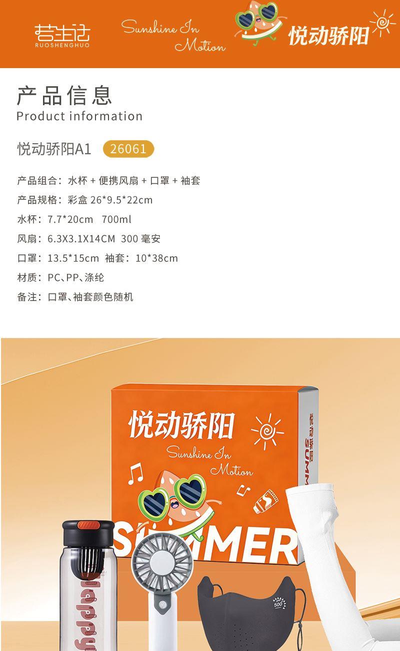 產(chǎn)品組合:水杯+便攜風(fēng)扇+口罩+袖套 水杯:7.7*20cm 700ml 風(fēng)扇:6.3X3.1X14CM 300毫安 口罩:13.5*15cm 袖套: 10*38cm 材質(zhì):PC、PP、滌綸 包裝:彩盒 重量/套:425g 備注:口罩、袖套顏色隨機